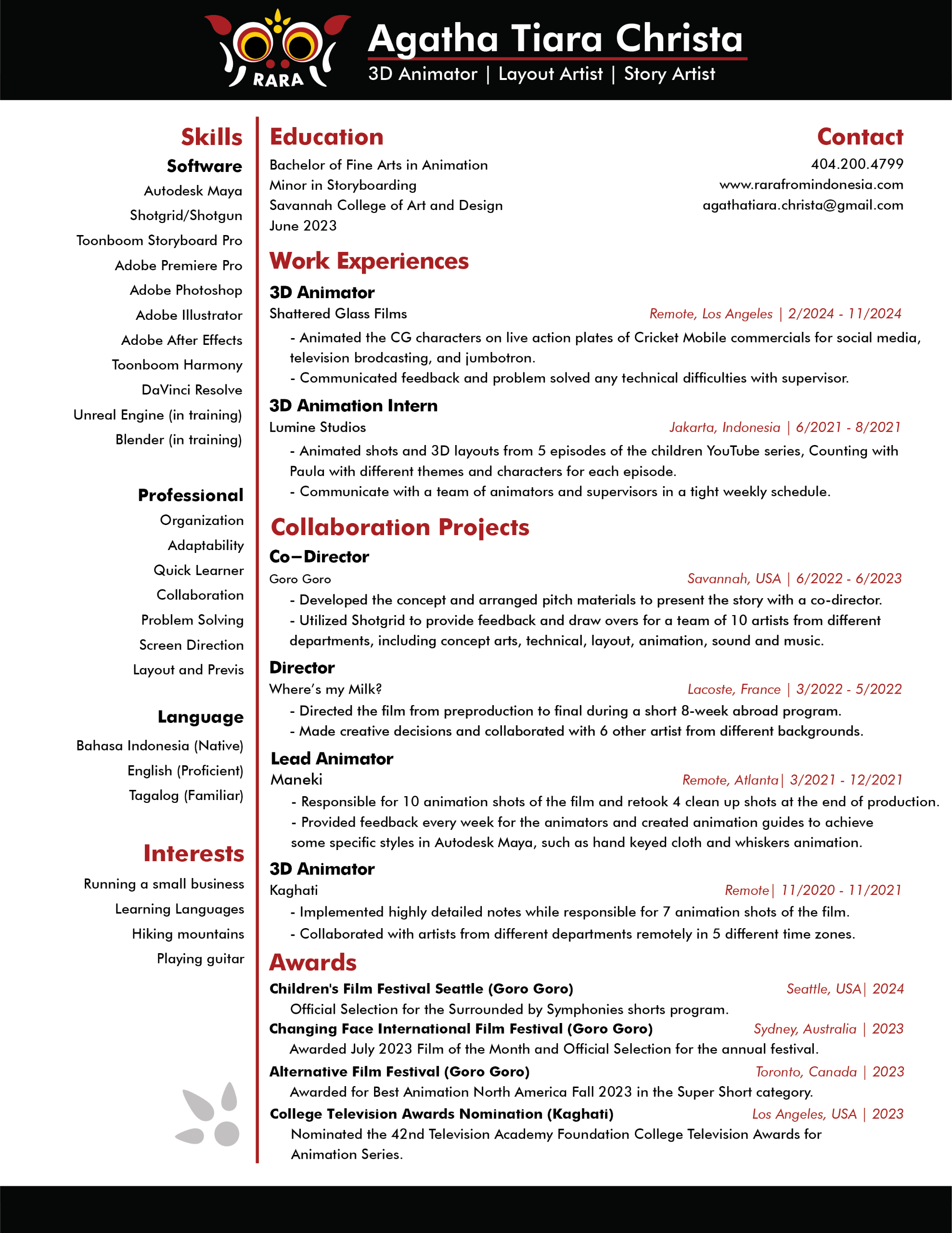 My name is Agatha Tiara Christa, but you can call me Rara. I am a 3D animator and layout artist from Indonesia, who also does storyboarding for fun. I graduated from SCAD in 2023 with a BFA degree in Animation and minor in Storyboarding. Currently, I'm working at Shattered Glass Film as a 3D animator!I love learning about people's cultures, languages, food, and even small traditions they do at home. I believe that these small things create stories and every single person has different stories to tell. Through animation, my dream is to inspire and entertain people from different parts of the world.
